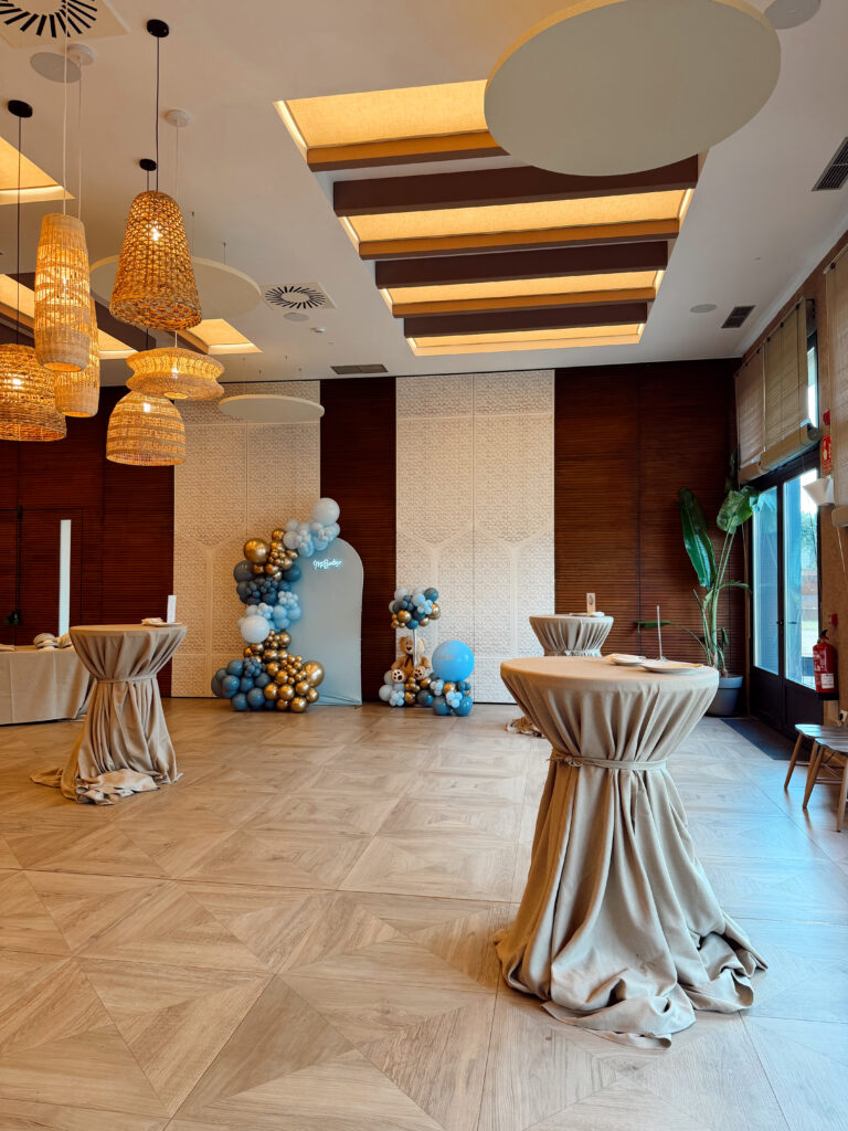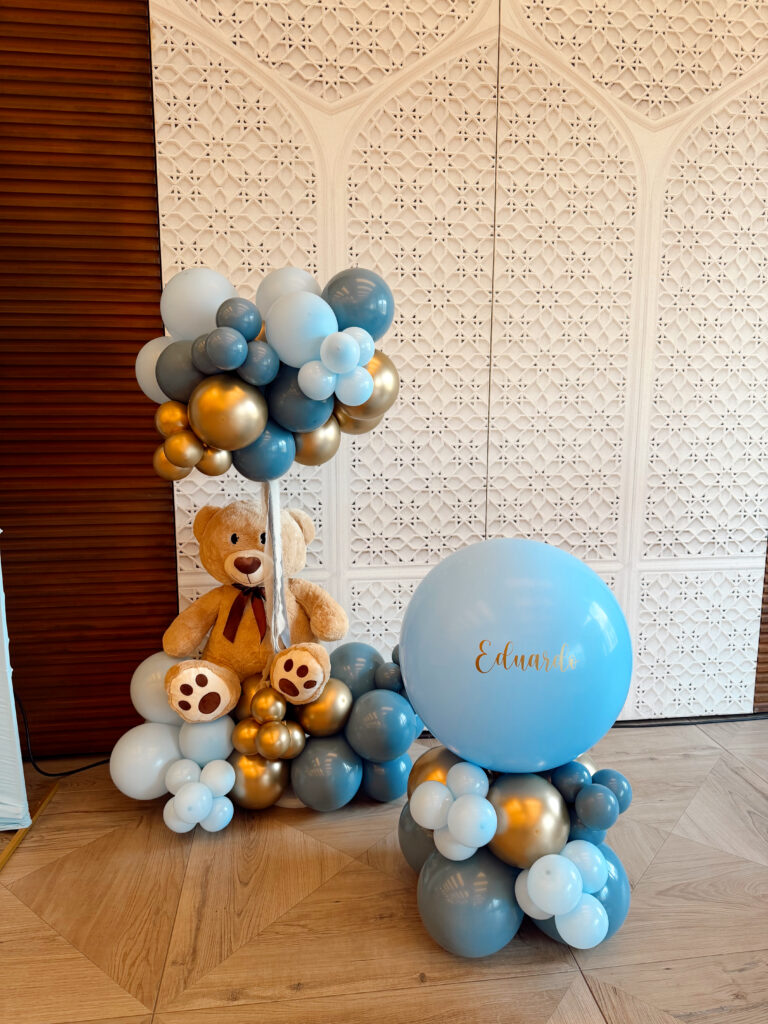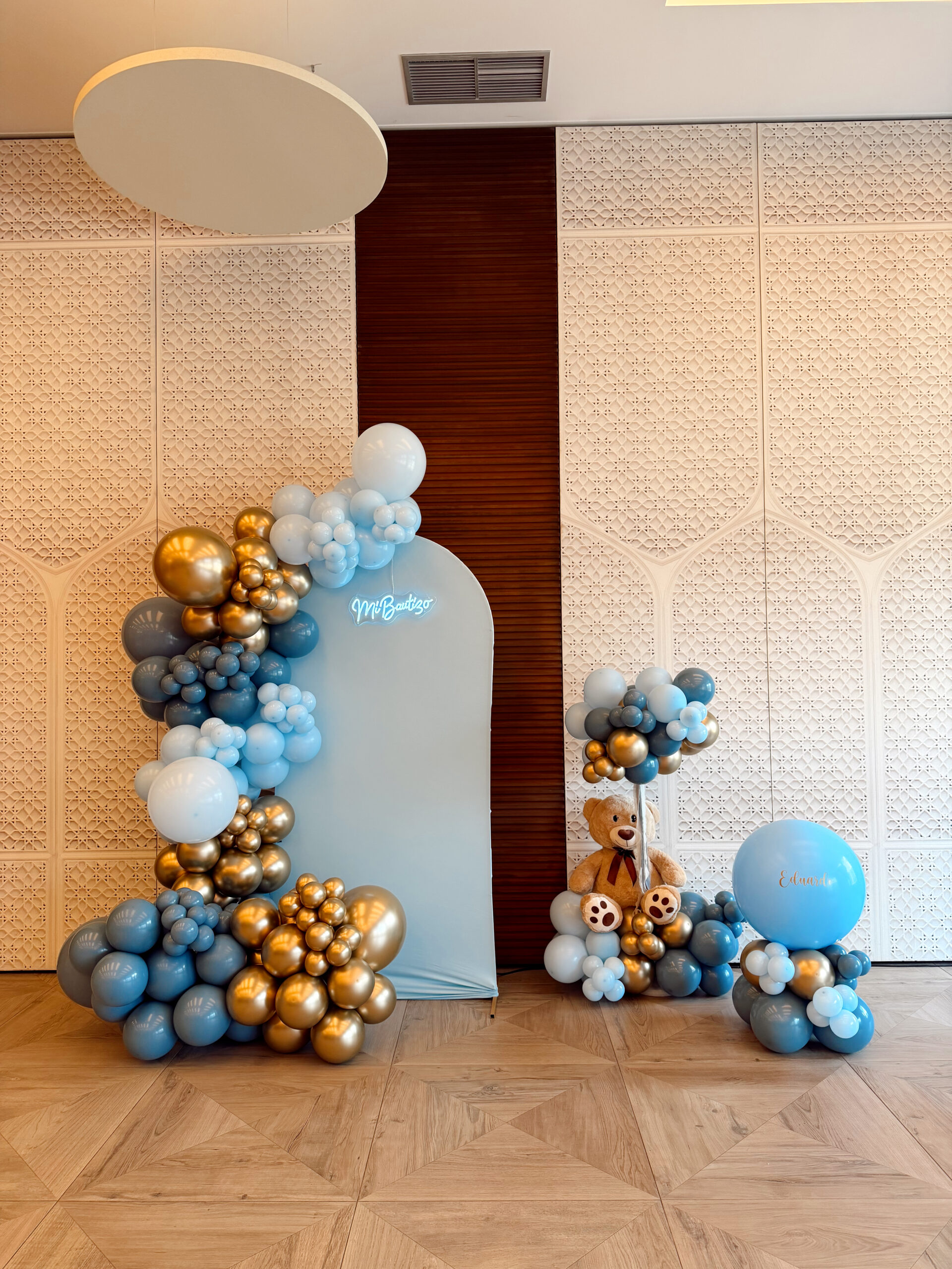 Creamos un bonito photocall en tonos azules y dorados, con una guirnalda de globos orgánica y un globo personalizado con el nombre del niño para la celebración del bautizo de Eduardo en Zibá.