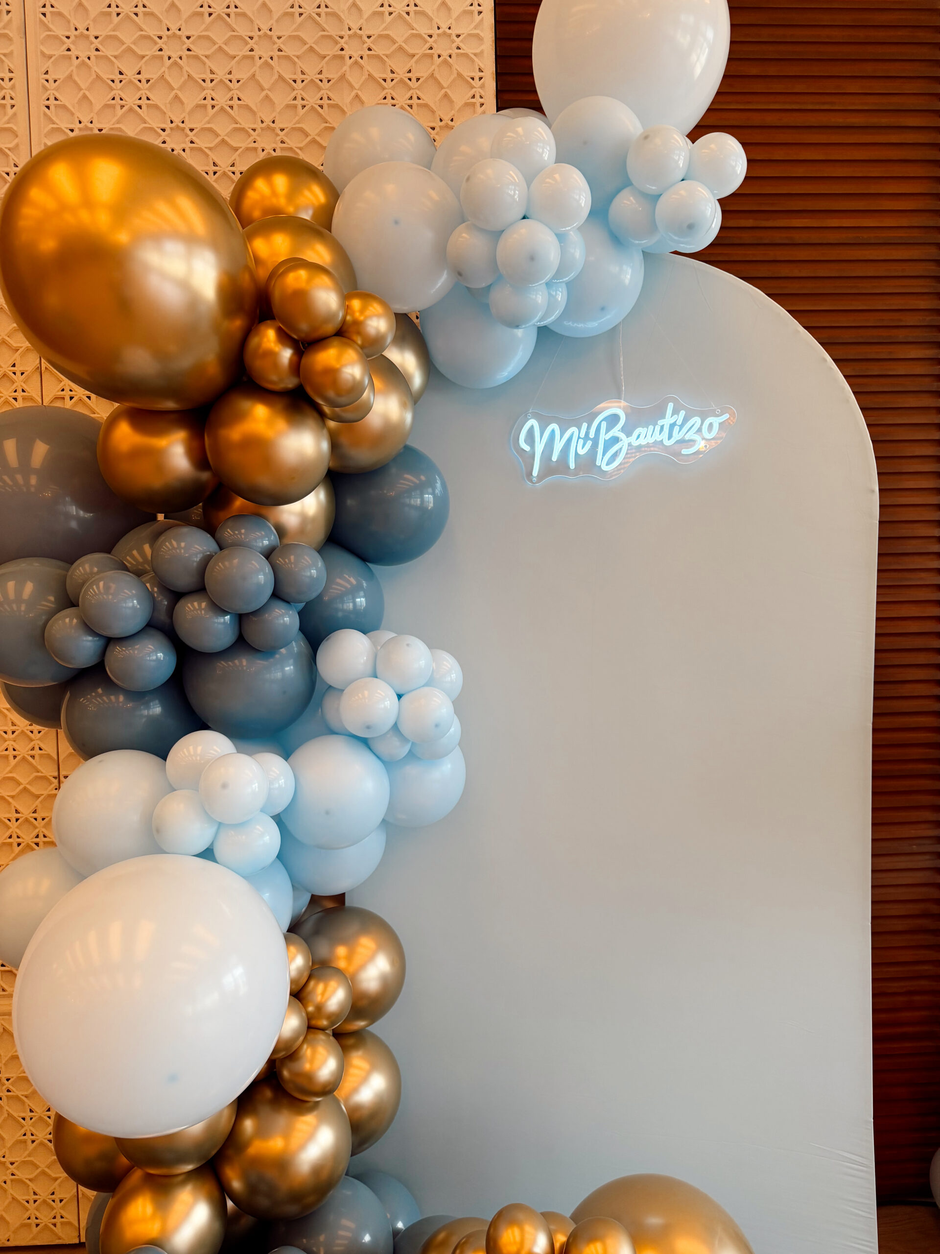 Una gran guirnalda de globos, un carrito dulce y salado y un globo de helio personalizado decoraron el bautizo de Gael.